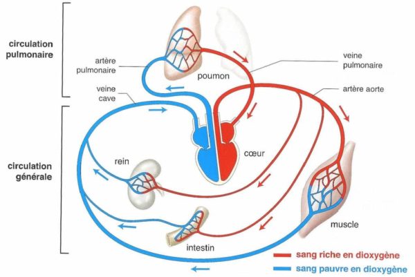 - et le sang « bleu », c’est-à-dire le sang pauvre en oxygène et vicié, vers les poumons afin de s’enrichir à nouveau en oxygène.
